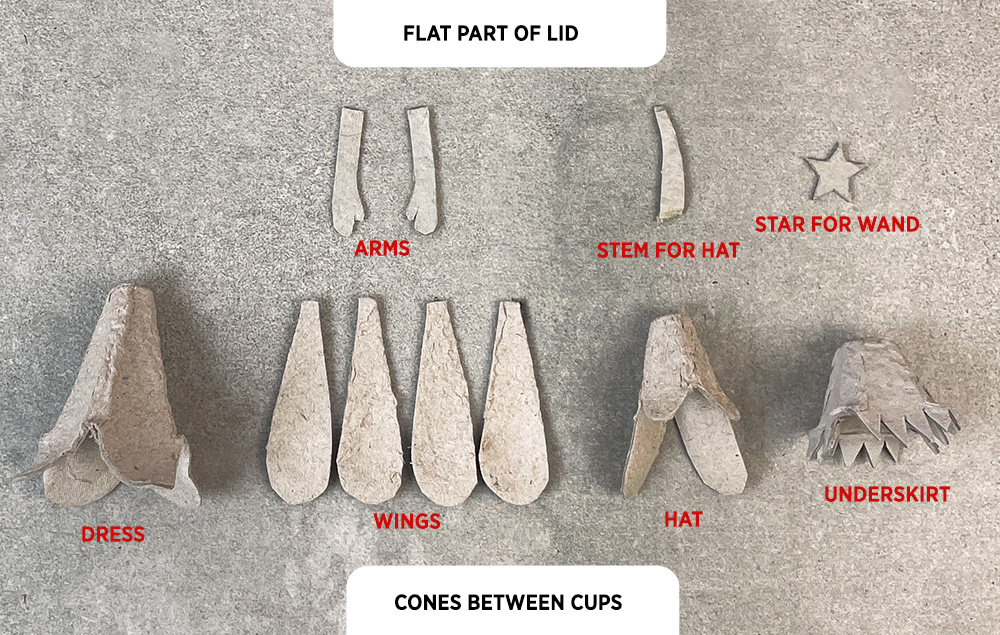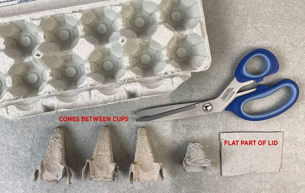 A) Cut out the pieces needed from an egg carton. You’ll need four cone shapes, plus a flat piece from the lid.