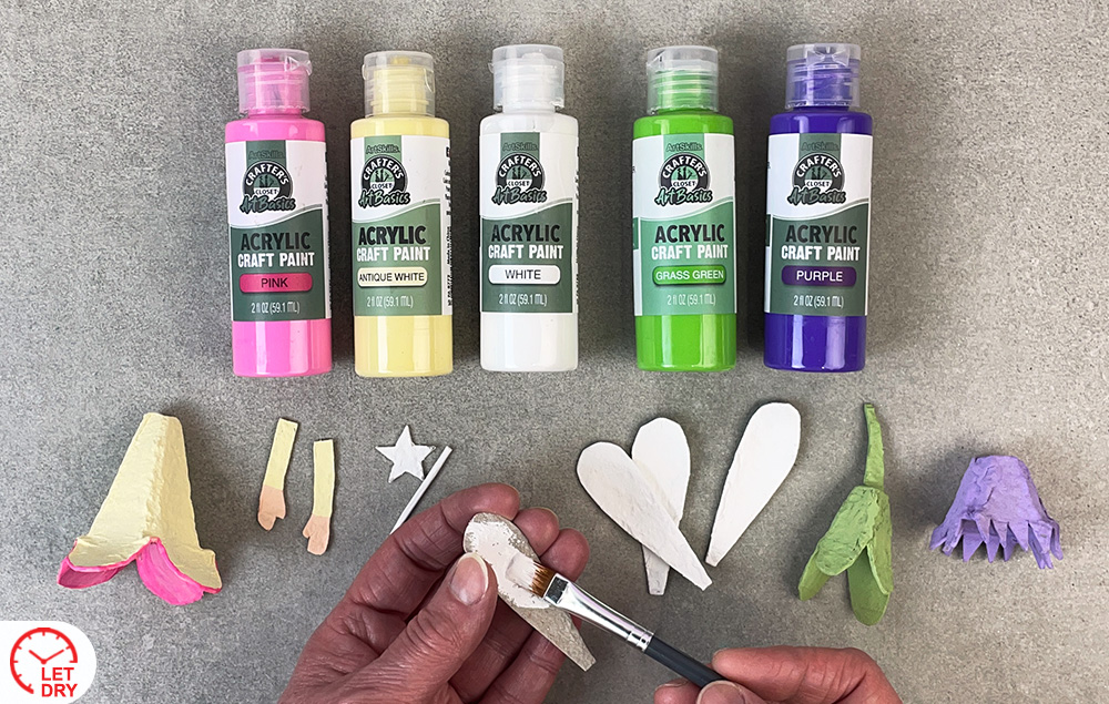 A) Paint the shapes. Use the fairy shown as inspiration or choose your own colors. Note: You’ll also need to paint half of a toothpick for the wand. Let everything dry.
