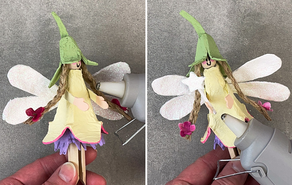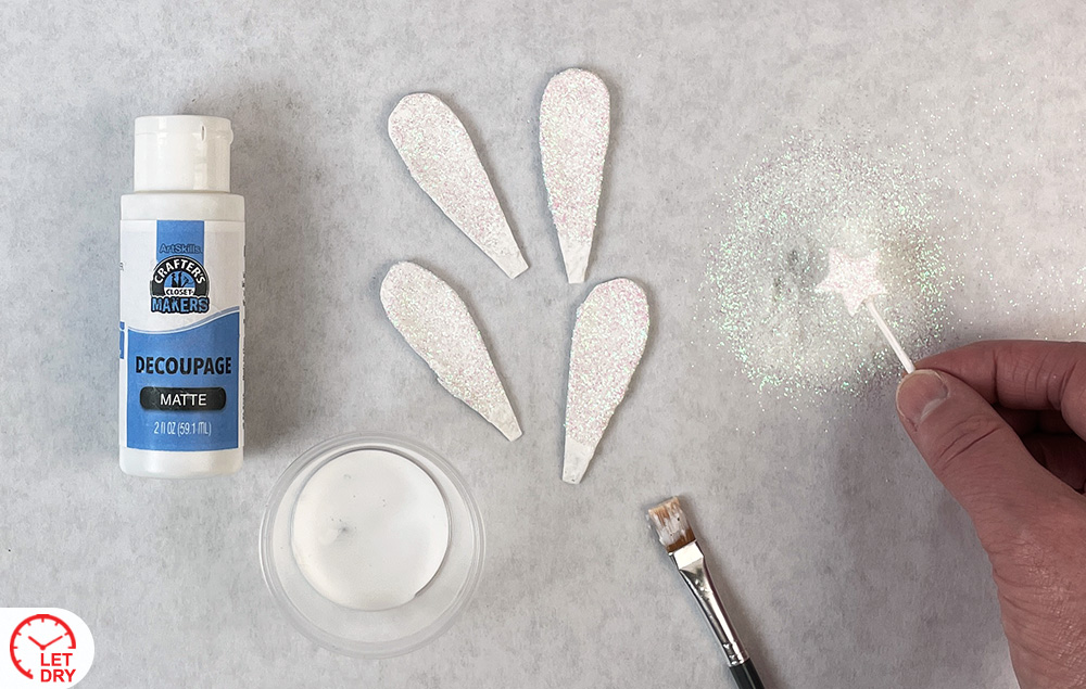 A) Add glitter to the wings and star wand using a decoupage medium. Tip: Don’t apply glitter to the narrow ends of the wings—you’ll be adding glue there in a later step.