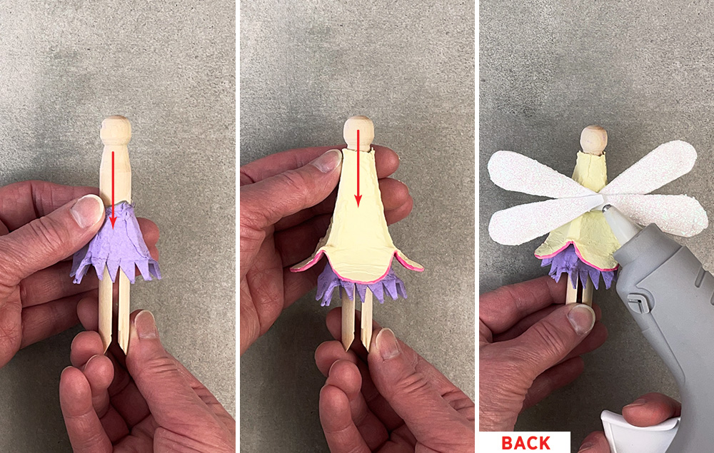 A) Let’s assemble the fairy! Slide the underskirt onto the doll pin.