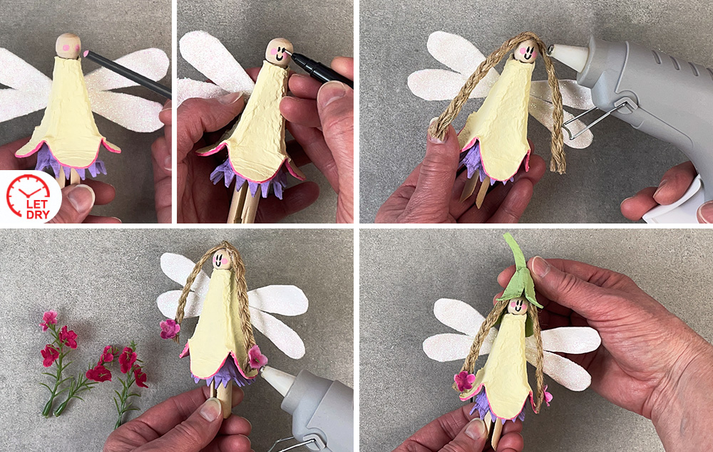 A) To make the fairy’s face, paint on pink cheeks and add eyes and a mouth with a fine black marker.