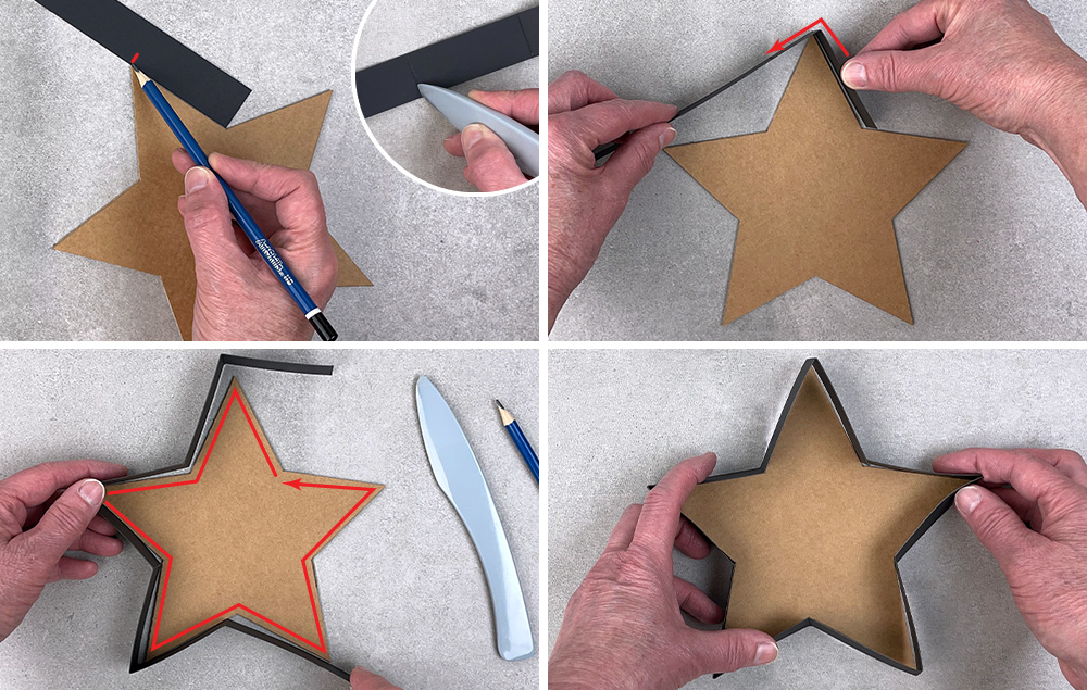 A) Use the inner and outer points of the cardboard star as guides to mark where to crease the long poster board strip.