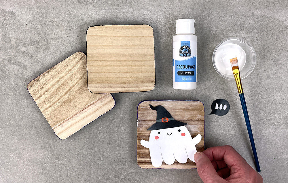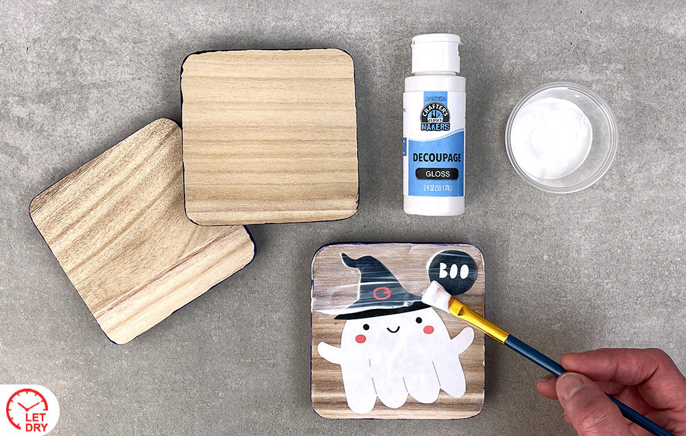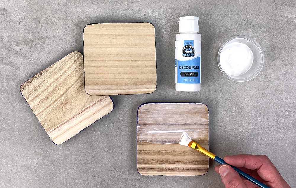 A) Apply a thin layer of decoupage medium to the top of a wood coaster.