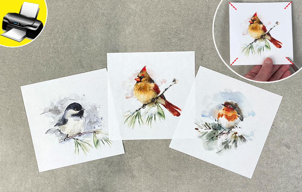 A) Print the provided artwork and cut out the designs. Note: There are cut marks indicated on the corners.