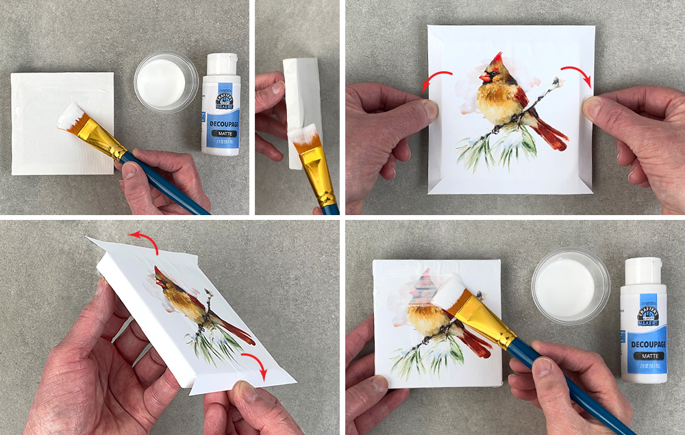 B) Press the design onto the wet decoupage medium and wrap the design around two opposite side edges.