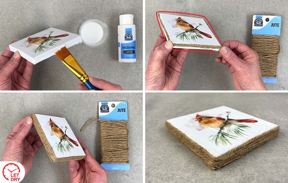 D) Apply a coat of decoupage medium over the front to seal the artwork.