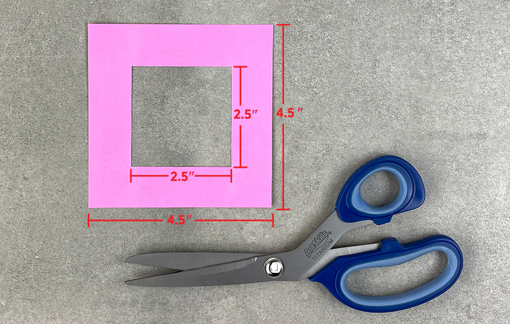 A) Cut a cardstock frame measuring 4 ½" square with a 2 ½" square opening in the center.
