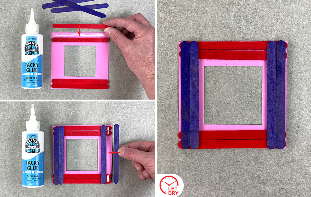 B) Then glue two more craft sticks along the left and right sides so they rest on top of the first set. Let dry.