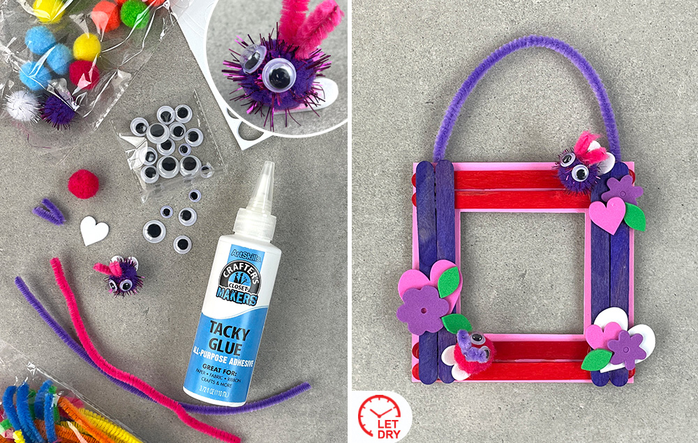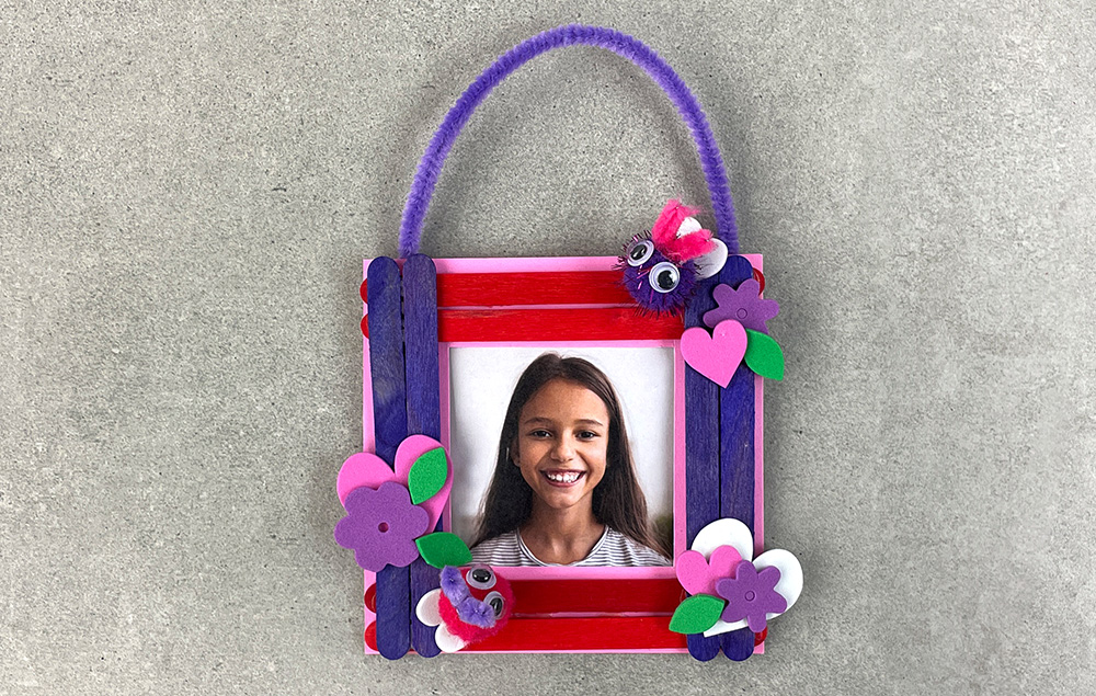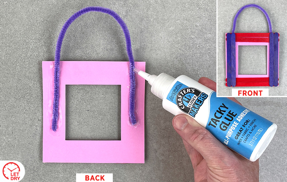 A) Glue a pipe cleaner to the back of the frame to create a hanger. Let dry.