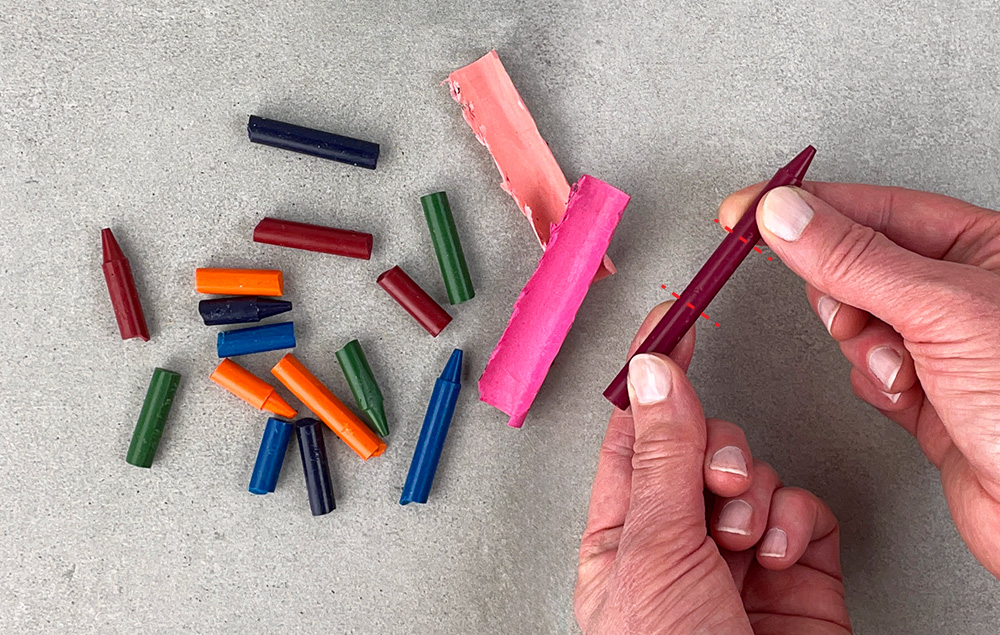 A) Prepare the crayons by removing the paper labels and breaking the crayons into halves or thirds.