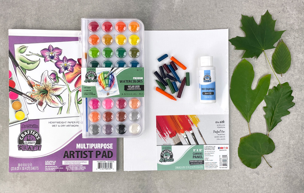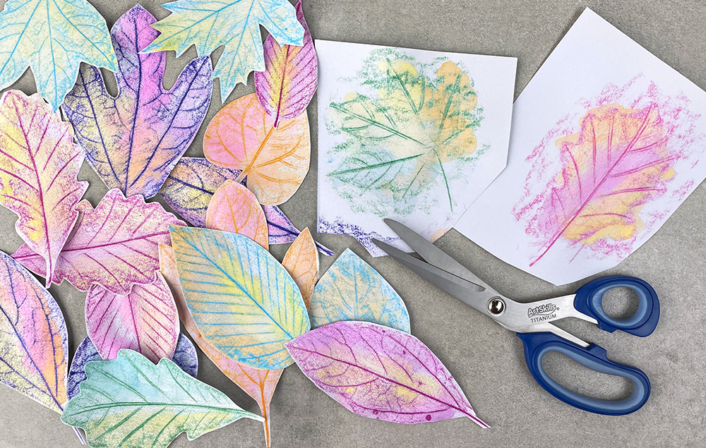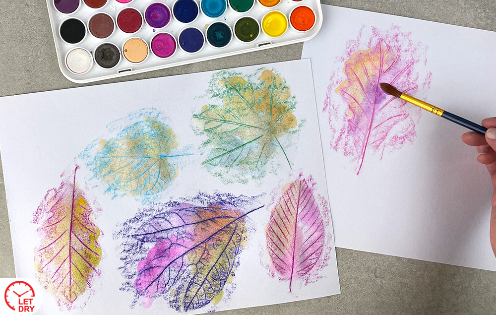 A) Paint over the leaf rubbings with watercolors and let dry.