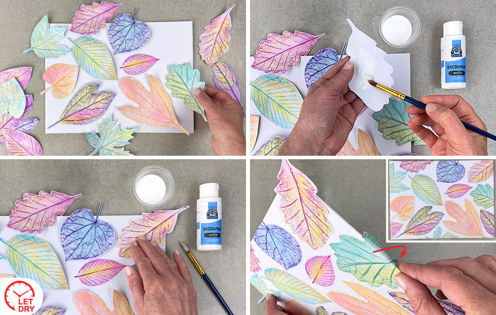 C) Press the leaf in place. Repeat to adhere all the leaves to the surface.