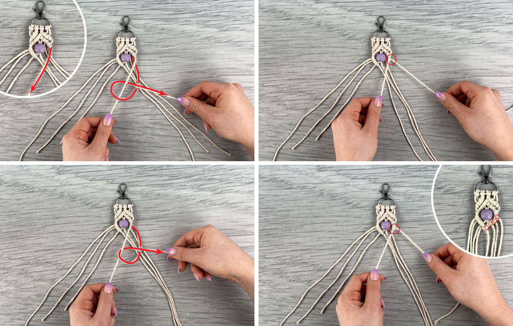 B) Use the four craft cords on the left as your working cords to make four knots. Pull taut so they are directly underneath the first row.