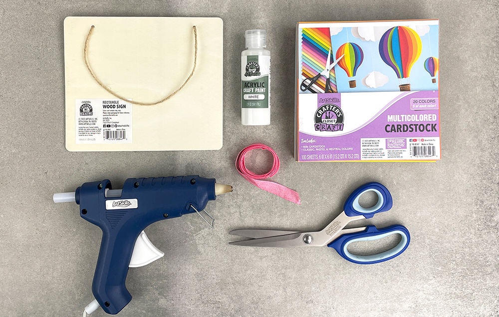 A) Hot glue the paper roses to the wood in the shape of a heart.