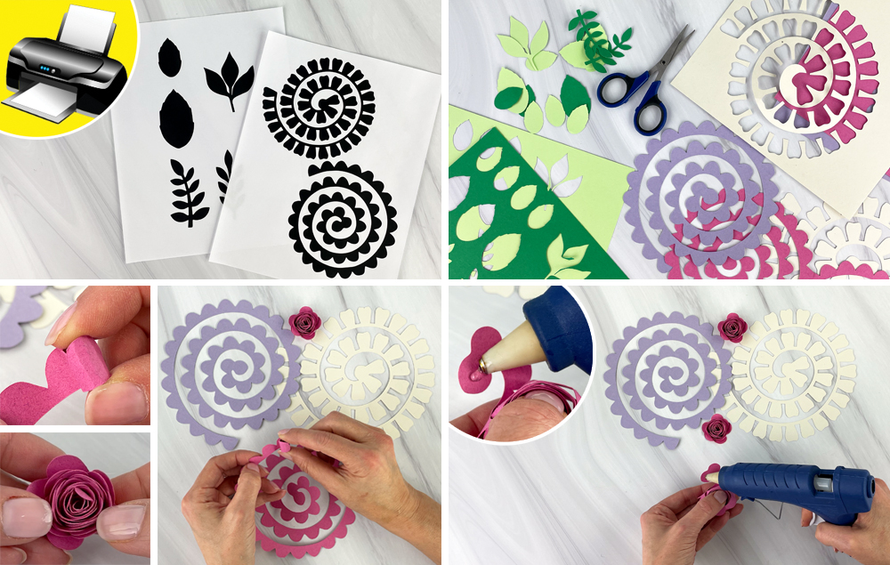 B) Cut out the flowers and leaves by hand. OPTIONAL: Use the file provided with your personal cutting machine.