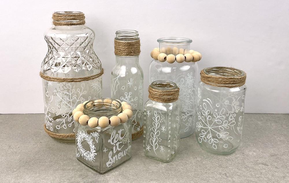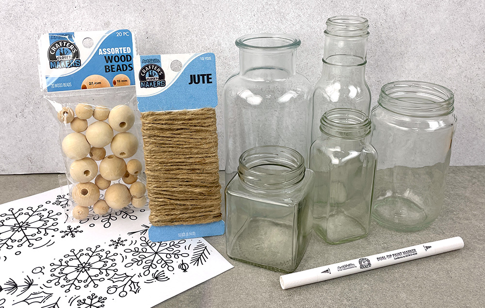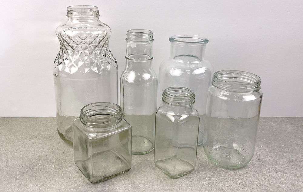 A) Gather recycled glass jars in assorted sizes and shapes. Remove any labels and adhesive, then wash and dry the jars thoroughly.