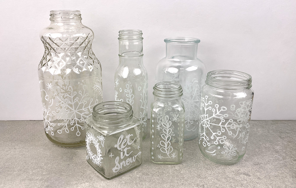 B) Using the pattern as a guide, draw designs on the glass with a white acrylic paint marker.